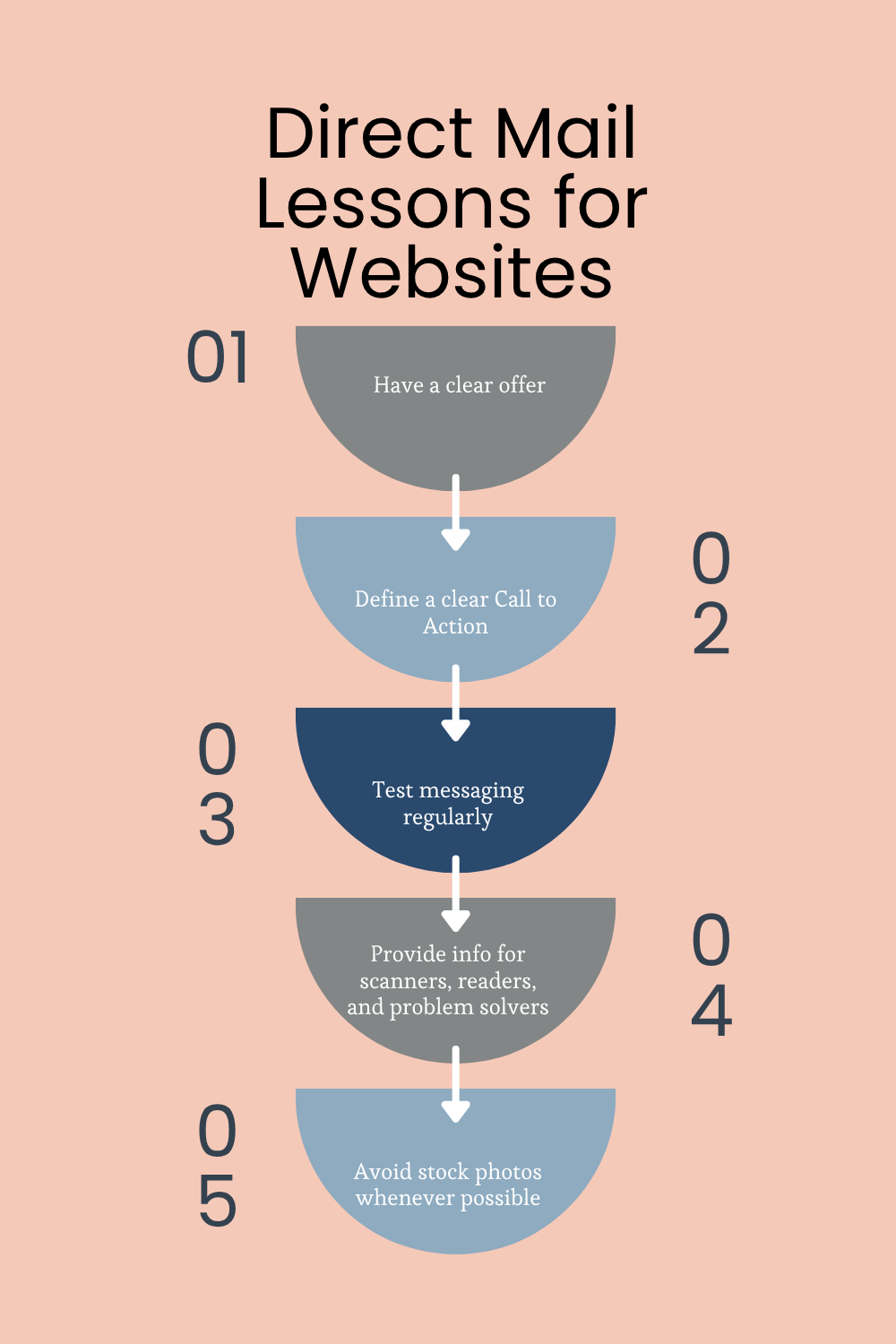 This infographic highlights the five direct response lessons Kristin Madeja recommends for building clearer, higher-converting websites.