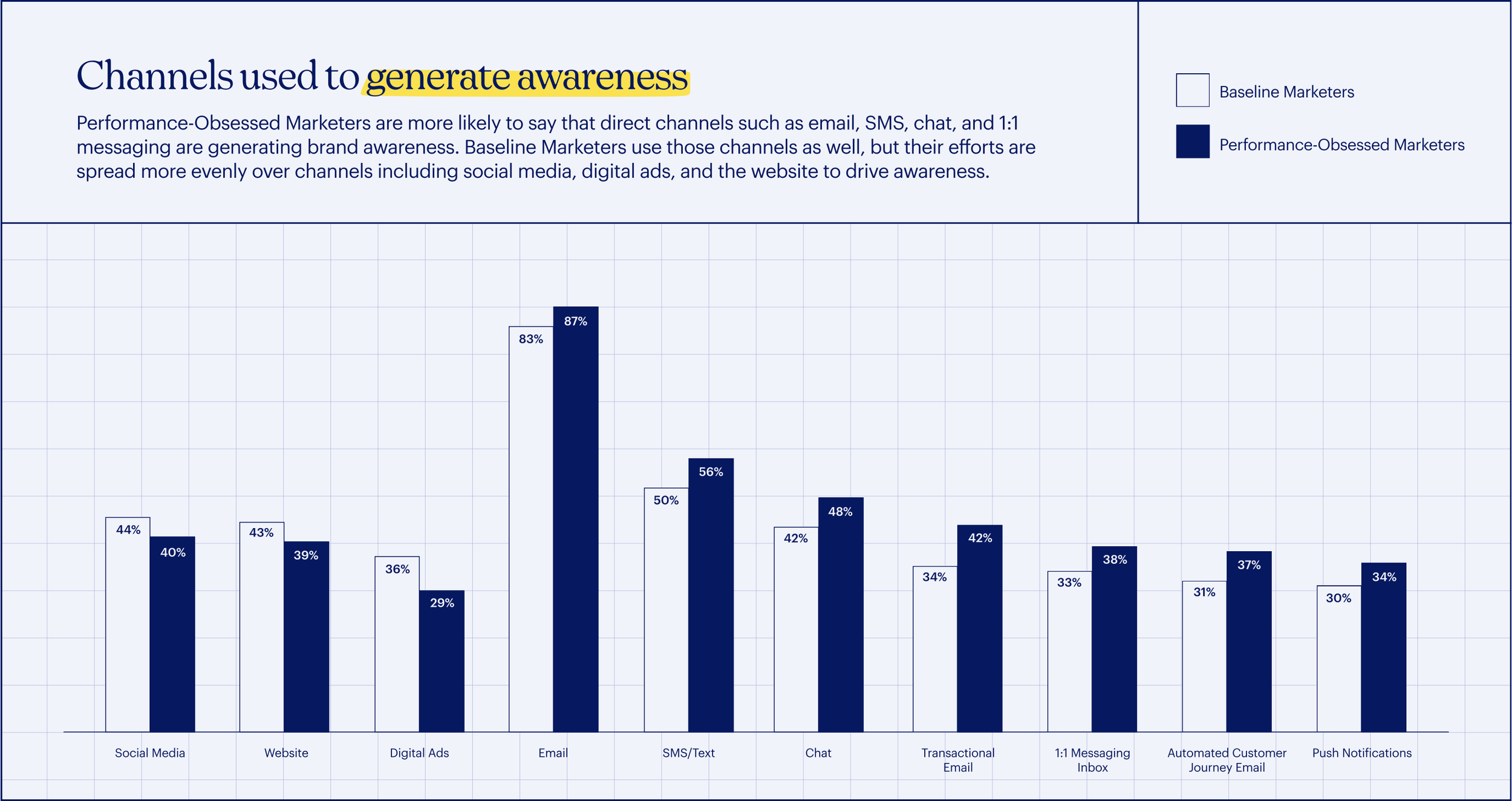 Performance-Obsessed Marketers lean more heavily on direct channels like email, SMS, and chat to generate brand awareness, while Baseline Marketers spread efforts across social media, websites, and digital ads. (Source: Mailchimp, The Revenue Blueprint, 2024)