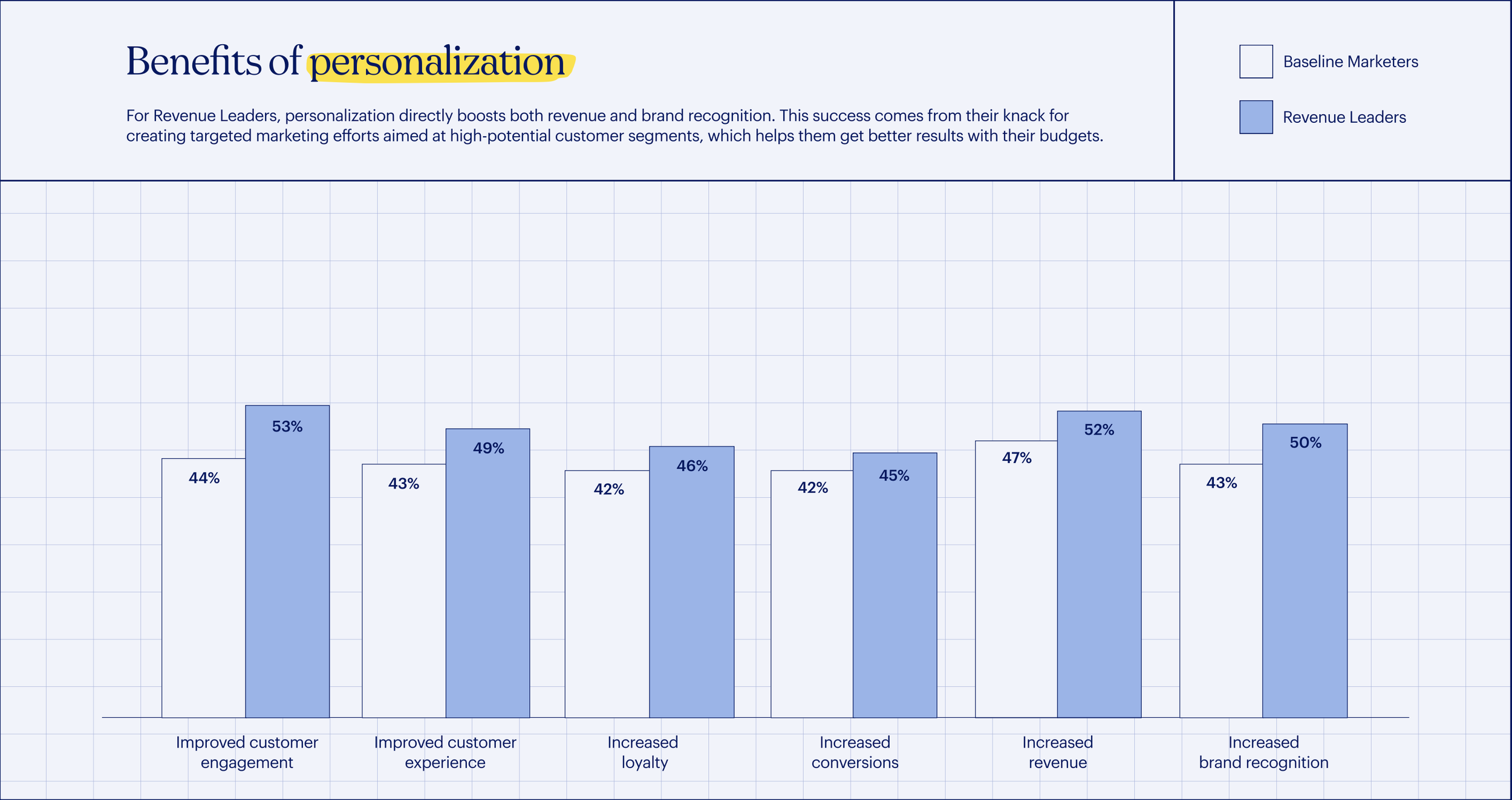 Revenue Leaders see stronger results from personalization, reporting higher customer engagement, loyalty, conversions, revenue, and brand recognition compared to Baseline Marketers. (Source: Mailchimp, The Revenue Blueprint, 2024)