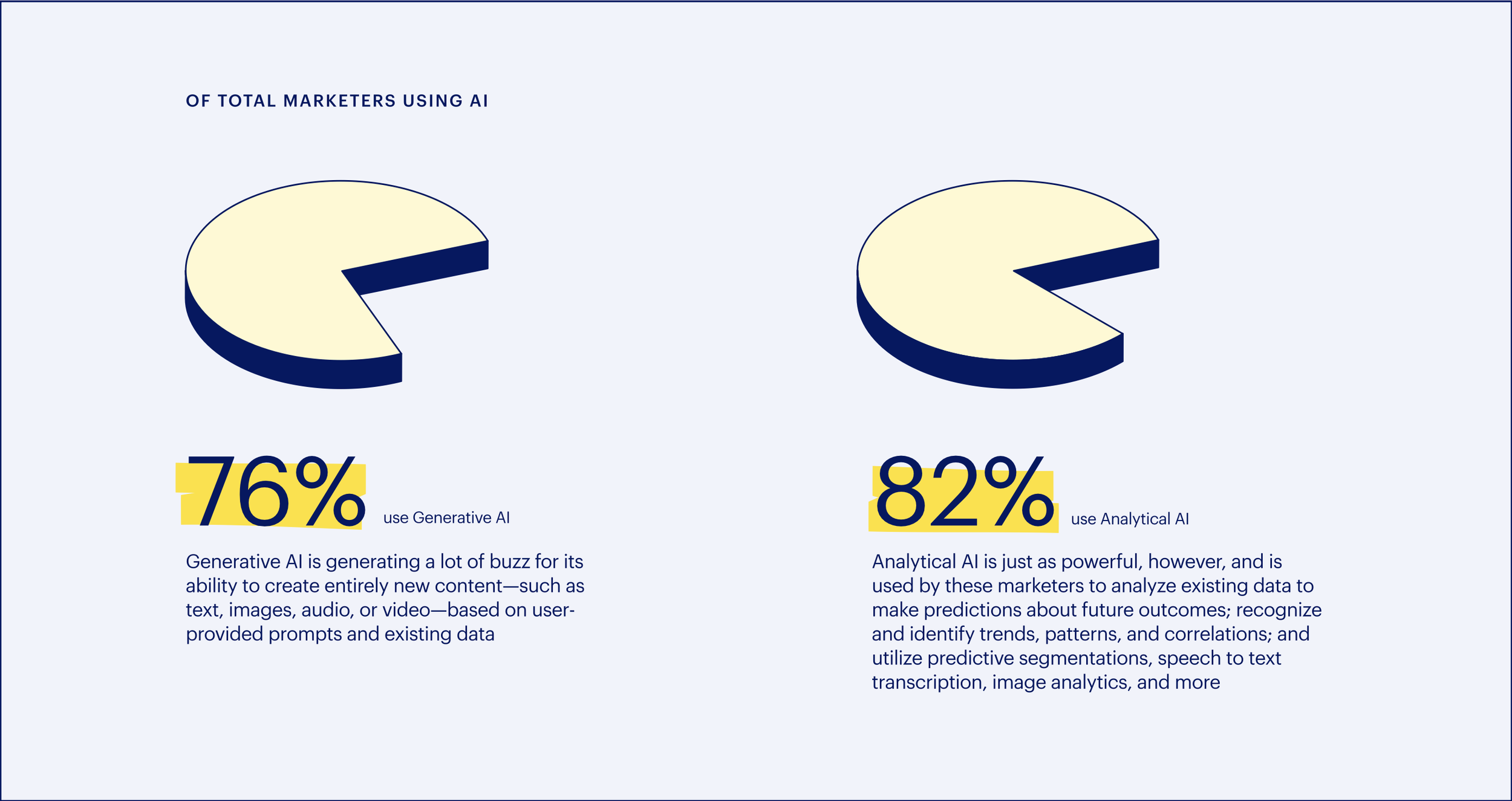Most marketers are already using AI, with 76% adopting Generative AI for content creation and 82% using Analytical AI to predict outcomes and spot trends. (Source: Mailchimp, The Revenue Blueprint, 2024)