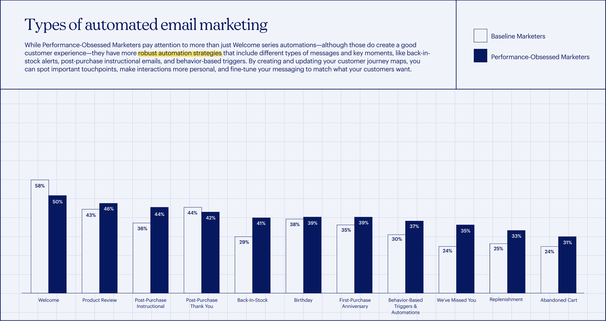 Performance-Obsessed Marketers go beyond welcome emails, using robust automations like back-in-stock alerts, post-purchase instructional emails, and behavior-based triggers to create more personalized customer journeys. (Source: Mailchimp, The Revenue Blueprint, 2024)