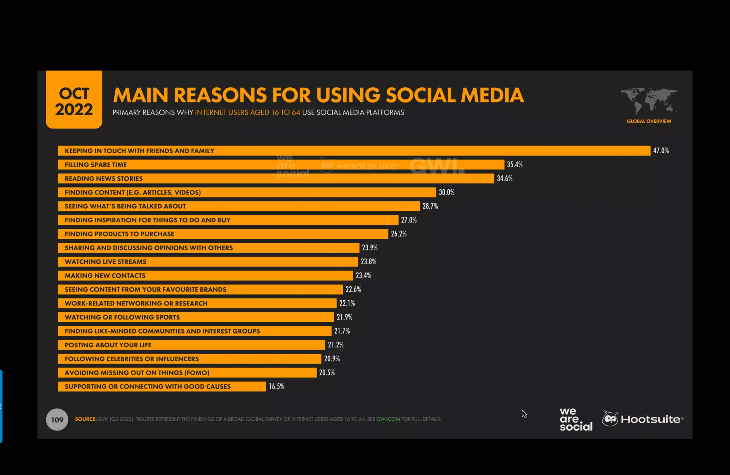 Remember when social media was just friends and family posting (maybe you’re too young. In which case, one of these days I’ll tell you about two brothers named MySpace and Friendster)? Although that’s not as much the case anymore, with businesses and brands marketing themselves. But even if brands are still there, that’s still why many of us open up social media apps. According to We are Social and Hootsuite’s most recent Global State of Digital Report, “keeping in touch with friends and family” is far and away the number one reason why people go on social media platforms. "Finding inspiration for things to do and buy” is the sixth reason, below “filling spare time” and “reading news stories.” So there are a number of reasons that your audience is using social media before you or your company even comes into their mind.